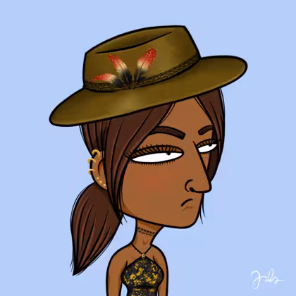 Collection Depressed Citizens Artist Juls Description ART. No team, no project, no future. Depressed Citizens is an urban & existential Art expression on Ordinals. In a parallel universe, "THEI" control us. DC unites against toxic society, encouraging critical thinking. 100% hand made collection that took Juls more than 6 months of daily work. Name Citizen#270 Origin Hispanic Gender Woman Necklace Choker Hat Fedora hat Mustache Beard No beard Glasses No Glasses Earrings Helix ring trio Hair Style Low ponytail Clothes Golden black halterneck top Tattoo No Tattoo Star Background Without stars