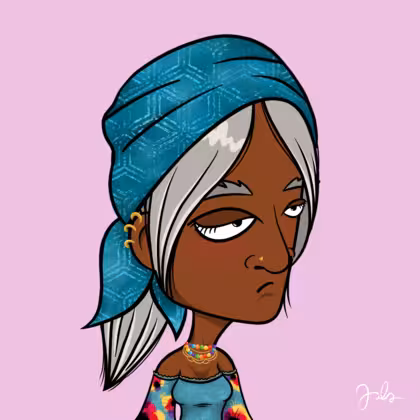 Collection Depressed Citizens Artist Juls Description ART. No team, no project, no future. Depressed Citizens is an urban & existential Art expression on Ordinals. In a parallel universe, "THEI" control us. DC unites against toxic society, encouraging critical thinking. 100% hand made collection that took Juls more than 6 months of daily work. Name Citizen#1512 Origin African descendant Gender Woman Necklace Colorful layered necklace Hat Printed head scarf Mustache Beard No beard Glasses No Glasses Earrings Helix ring trio Hair Style Low ponytail Clothes Abstract flowers blue blouse Tattoo No Tattoo Star Background Without stars