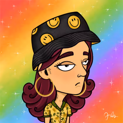 Collection Depressed Citizens Artist Juls Description ART. No team, no project, no future. Depressed Citizens is an urban & existential Art expression on Ordinals. In a parallel universe, "THEI" control us. DC unites against toxic society, encouraging critical thinking. 100% hand made collection that took Juls more than 6 months of daily work. Name Citizen#3168 Origin LGBT-Q+ Gender Non-binary Necklace No Necklace Hat Smiley bucket hat Mustache Beard No beard Glasses No Glasses Earrings Beading hoops Hair Style Long wavy Clothes Palm tree holiday shirt Tattoo Blessed tattoo Star Background With stars